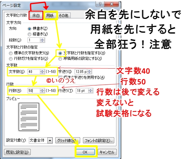 まずはこの設定をして、受験番号と名前書いて、Word文書を2枚作る。