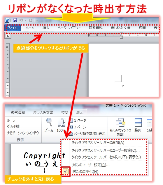それで、リボンを出す方法というか、復活方法を教えてます。